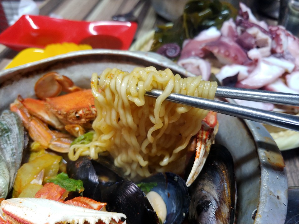 문어숙회가 나오고 나서도 한참을 기다렸다가 해물라면을 만날 수 있었어요. 싱싱한 문어숙회를 눈 앞에 두고도 라면이 나올때까지 기다리고 기다린 후에야 먹을 수 있었답니다.