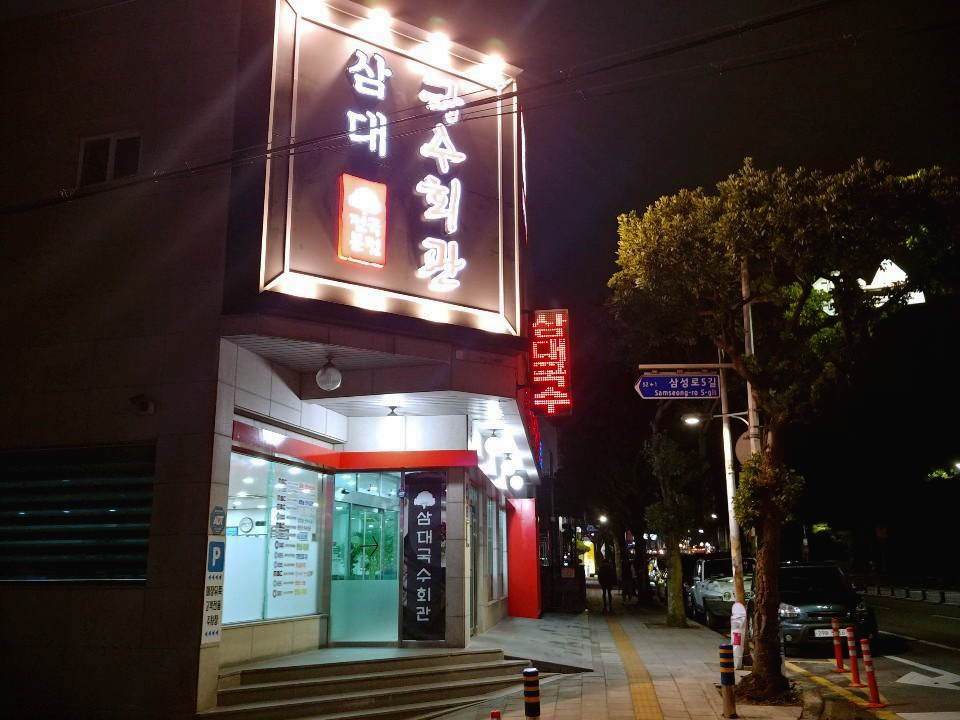 한라산에서 통하는 길을 쭉 가로질러 늦은 저녁을 먹기위해 방문한 곳 바로 삼대국수회관입니다. 제주시가 본점이에요. 위에서 언급을 했듯이 고기국수가 유명한 곳이랍니다. 원래 외관도 이렇게 크지 않았었는데 예전에 왔을 때와 많이 바뀌었다고 동창이 그러더라구요.
