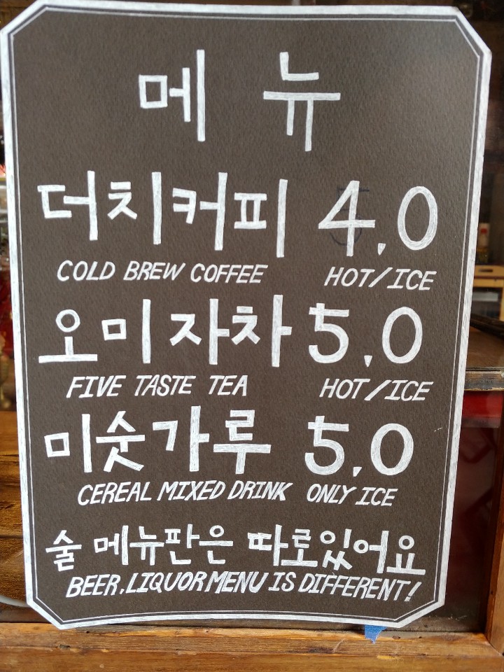 서쪽가게 내부를 들어가면 메뉴는 정말 간단하게 되어있는걸 볼 수 있어요. 이따 소개해드리겠지만, 다양한 빈티지한 물건들이 주력인 카페이기 때문에 메뉴는 최소화시킨 듯 해요.