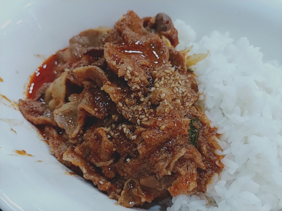 고기는 대패를 사용했구요. 양념장은 된장이 좀 섞여들어 간 느끼이에요. 꼬들꼬들한 밥에 제육소스가 비벼지면 밥의 식감도 먹기 좋게 바뀐답니다. 우선 고기의 양이 적지않아서 좋구요. 고기의 식감을 그대로 살려놓았기 때문에 입을 즐겁게 할 수 있어요.