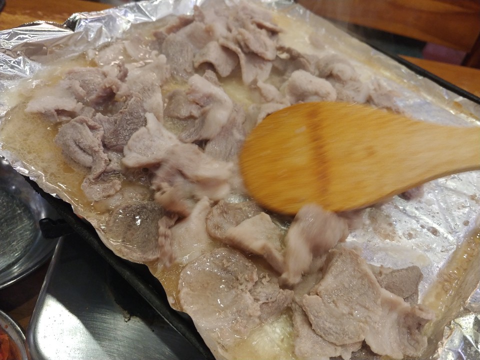 다이나믹하게 움직이는 주걱 보이시나요. 돼지고기도 아주 노릇노릇하게 잘 구워지고 있습니다. 아주 흐믓하네요. 조리가 되는 과정에서 이제 어떻게 먹으면 좋을지 생각을 해봤는데요. 바로 반반.