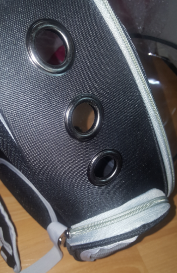 가방의 옆 면을 보면 저 동그란 구멍 3개가 보이는데, 반려동물 숨구멍이라고 보면 돼요.