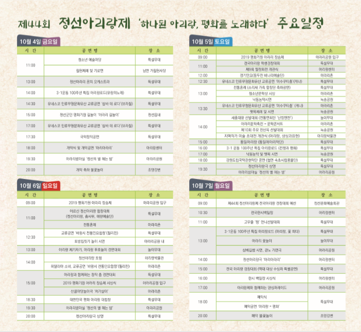 2019 정선아리랑 축제 [ 아라리공원 정선공설운동장 주차장 프로그램 일정 ]