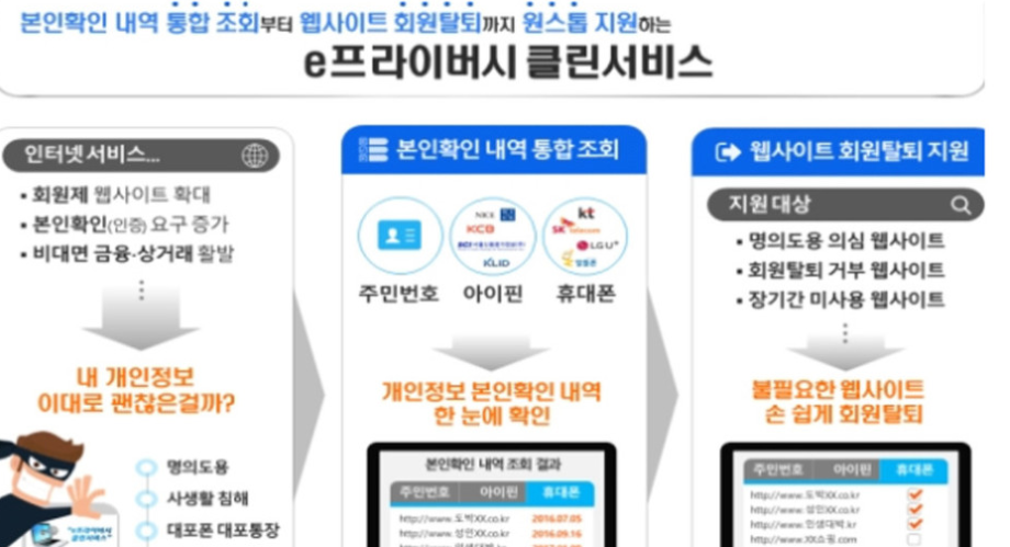 e프라이버시 클린서비스는 행정안전부와 한국인터넷진흥원이 국민의 개인정보를 보호하고 명의도용, 사생활침해 등 피해를 예방하기 위해 운영중인 서비스랍니다.