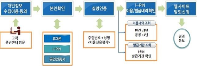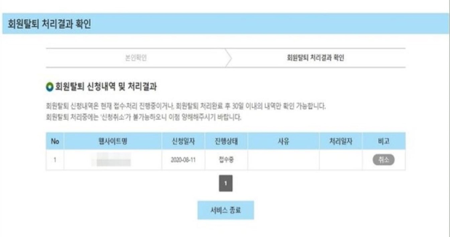 사이트 목록이 나오면 표시된 웹사이트 중 불필요하다고 생각되거나 도용이 의심되는 웹사이트에 대해 회원탈퇴를 요청할 수 있으며, 회원탈퇴를 요청하면 한국인터넷진흥원에서 일괄적으로 회원탈퇴 처리를 대행하고 그 결과를 사용자에게 통보해 준답니다.