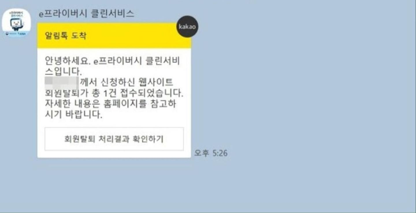 탈퇴 처리가 완료되면 E프라이버시 클린서비스 측에서 카카오톡을 통해 처리결과 확인 메세지를 보내주니 수시로 확인해야 하는 수고스러움은 겪지 않아도 된답니다.