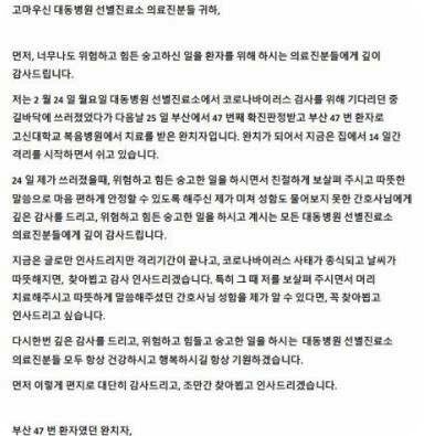 부산47번확진자는 지난 3월 초 코로나 완치 판정을 받았고 퇴원한 뒤 대동병원, 동래구보건소, 고신대복음병원 등에 감사편지를 보냈고 이후 가슴통증과 두통과 같은 후유증이 지속되자 지난 5월 부산 47이라는 페이스북 계정을 만들어 근황을 업데이트 하고 있는 중이랍니다.