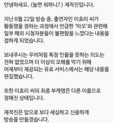 이 내용은 MBC프로그램 놀면뭐하니에서 지난 방송과 관련된 내용인데요.
