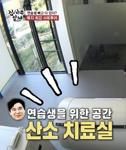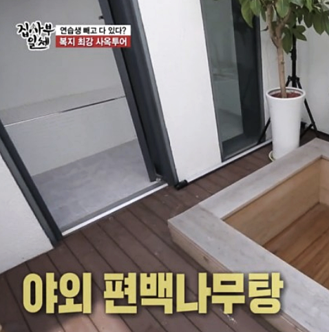 이후 소개된 사옥에서는 직원과 연습생을 위한 산소 캡슐, 편백나무 온천탕, 헬스장, 구내식당 등 어마어마한 복지시설이 갖춰져 있는 걸 볼 수 있었답니다. 복지가 정말 잘 되어 있더라구요. 또 곳곳에 보이는 그의 얼굴 스티커를 통해 그의 자기애를 느낄 수 있기도 했어요.