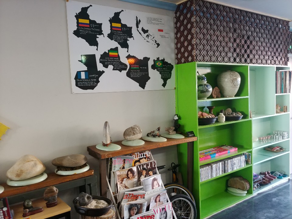 수다 카페의 분위기는 대체적으로 빈티지한 느낌이 있답니다. 곳곳에 돌도 놓여져있고 벤치에 기타에 미니 골프연습에 어렷을 적 할머니 댁에서 볼 수 있었던 가구 등등 다양한 물건들이 모여있는데 그 느낌이 겉돌지 않고 하나로 자연스레 녹아드는 느낌이 좋았어요.