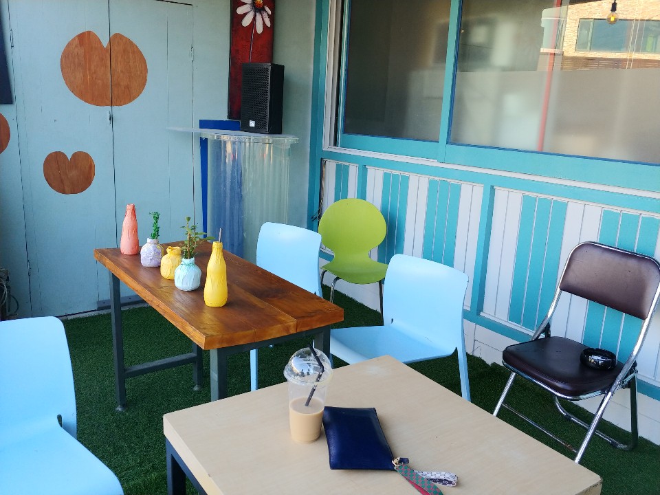 여기가 제부도 카페 수다카페의 바다뷰를 볼 수 있는 테라스에요. 창은 뚫려있어서 강한 햇빛이 들어오기두하구 바닷바람도 솔솔 들어온답니다. 더운 여름에 갈 때에는 좀 더울 수 있어요. 햇빛이 강하기 때문에요.