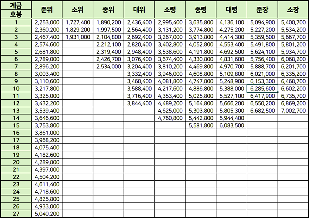 (27호봉까지 있지만 부사관 최대 호봉 월급 기준 끝이 22호봉이기에 추가하지 않았습니다.)