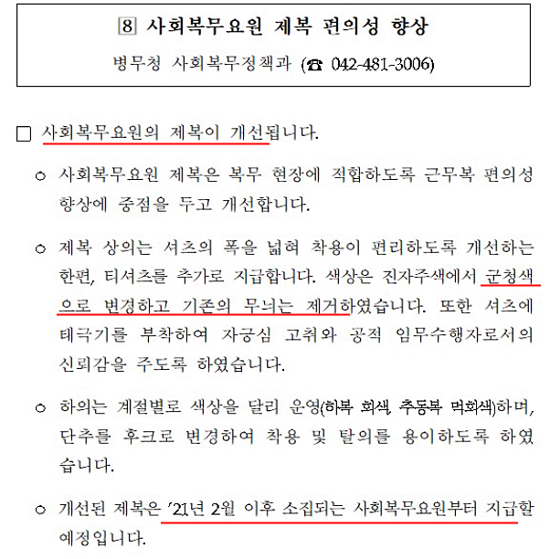 2021년 2월 이후 소집되는 요원들부터 제복은 변경될 예정이며, 하복, 추 동목의 경우 기존 자주색 셔츠 2장, 먹회색 바지 2장에서 군청색 셔츠 1장과 군청색 티쳐스 2장, 회색바지 2장으로 변경될 예정이라합니다. 이번에는 불편함을 덜기 위해 사회복무요원들의 의견과 의상학 전공자들의 의견, 의상관련 대학교수님의 의견을 모두 반영하여 결정하게 되었다는 이야기.