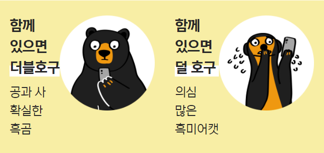 누구를 가까이 하면 좋은지에 대한 유형도 나온다. 흑곰과 함께 하면 더블호구, 흑미어캣과 함께하면 덜호구. 요 호구 성향 테스트 타입을 보면 전부 앞에 흑이 붙는 것 같다. 흑곰은 공과 사가 확실한데 왜 당하지?