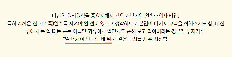 호구테스트 결과를 보면 이렇게 풀이도 나온다. 겉으로 보기엔 완벽주의자 타입. 하지만 '겉으로 보기엔'이라는 거지 알고보면 허당.. 내가 딱 그렇다. 특히 마지막 멘트, "얼마 차이 안 나는데 뭐~" 정말 많이 썼는데 왜이리 정확한거야.ㅋㅋ.