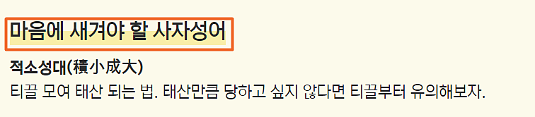 오늘부터 노트에 적어!! 마음에 새겨야 할 사자성어도 알려준다. 적소성대? 처음 들어보는데 찾아보면 쌓을 적, 작을 소, 이룰 성, 큰 대의 한자가 모여 만들어진 사자성어다. 티끌모아 태산이라는 말로 크게 당하고 싶지 않으면 작은 것부터 조심하라는 말... 이렇게 노트를 꺼내본다.