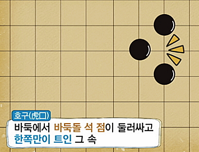 세번째는 바둑에서 바둑돌 석 점이 둘러싸고 한족만이 트인 그 속을 말한답니다. 이렇게 석점이 둘러싸게 되면 바둑돌이 그대로 잡혀버리게 되기 때문에 호랑이 입이라는 의미로 쓰인다네요.