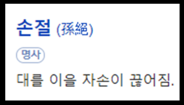 우선 손절의 사전적 의미를 보면 '대를 이을 자손이 끊어짐'으로 나오는 것을 볼 수 있어요. 한자의 조합은 손자손, 끊을절. 이러한 뜻을 가진 비슷한 말로는 무후, 절후, 절손이 있어요.
