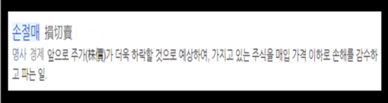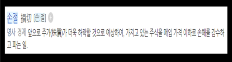 많이 쓰이는 단어가 되다보니 국어사전에 역시 올라와 있는 것을 볼 수 있는데요. 주식시장에서의 손절뜻은 '앞으로 주가가 더욱 하락할 것으로 예상하여, 가지고 있는 주식을 매입 가격 이하로 손해를 감수하고 파는 일'이라고 설명이 되어 있답니다.