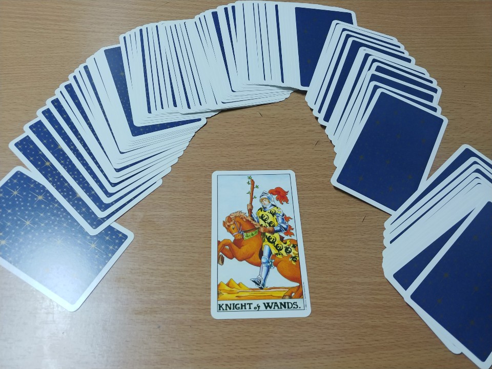 이렇게 내일 어떤 일이 있을지 알려주세요. 맘속으로 주문을 외우며 카드를 펼친 후 카드를 뽑아보니 완즈 오브 나이트가 나왔습니다.