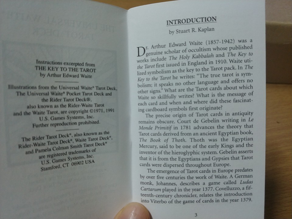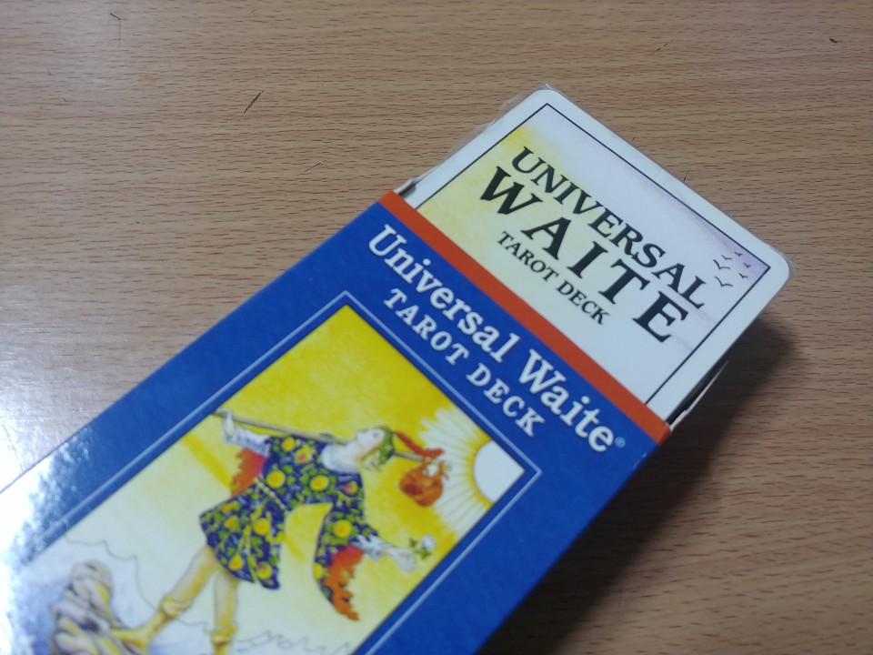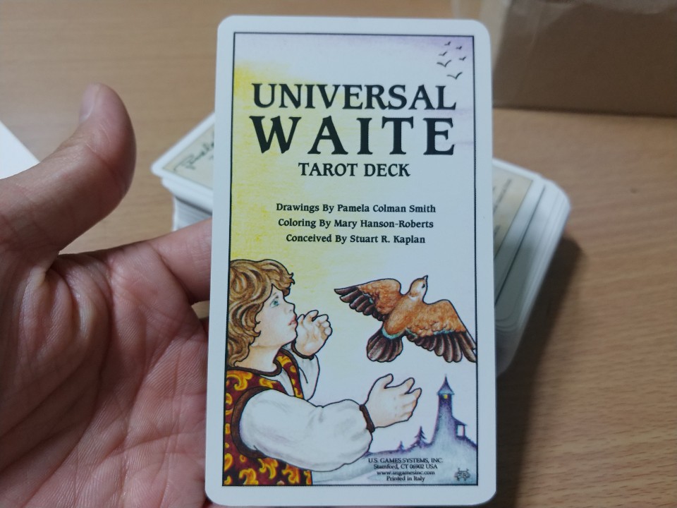 떨리는 마음으로 꺼낸 타로카드. 첫장엔 유니버셜 웨이트 타로 덱 이라고 쓰여져 있어요.