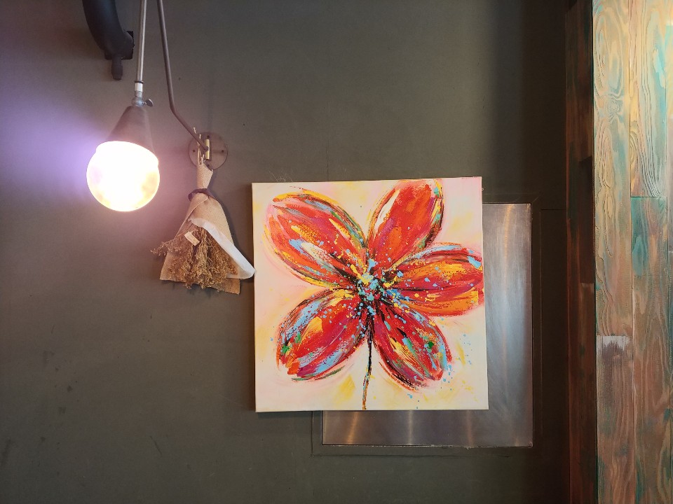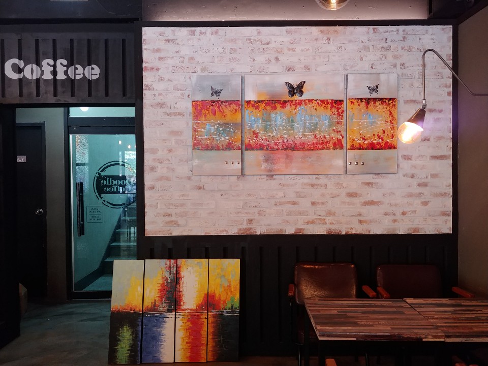 꽃이길 꽃집과 함꼐 운영중인 가경동 가경터미널 시장 두들커피. 기억에 남았던 또 하나의 이유는 카페컨셉과 너무나도 잘 어울리는 그림들이었어요. 그림이 많지는 않았지만 벽의 색감과도 잘 스며드는 꽃과 나비그림은 카페 분위기를 한 층 더 살려주었답니다.