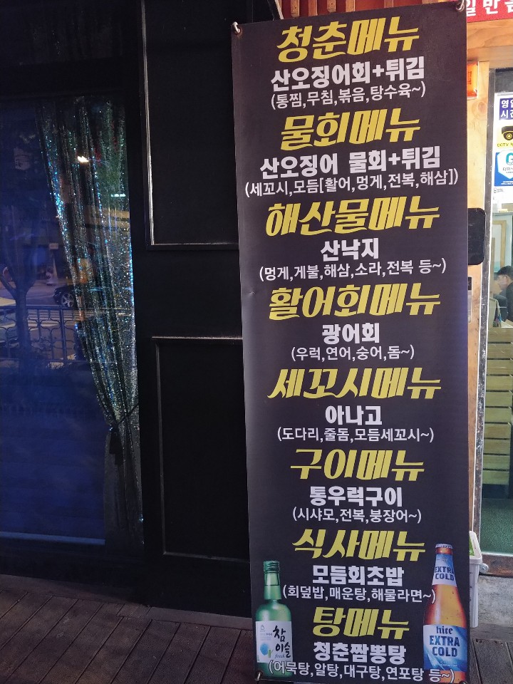 청주 강서동 오징어청춘. 횟집이라고 보셔도 돼요. 이름은 오징어청춘이지만 다양한 회들이 많이 있답니다.