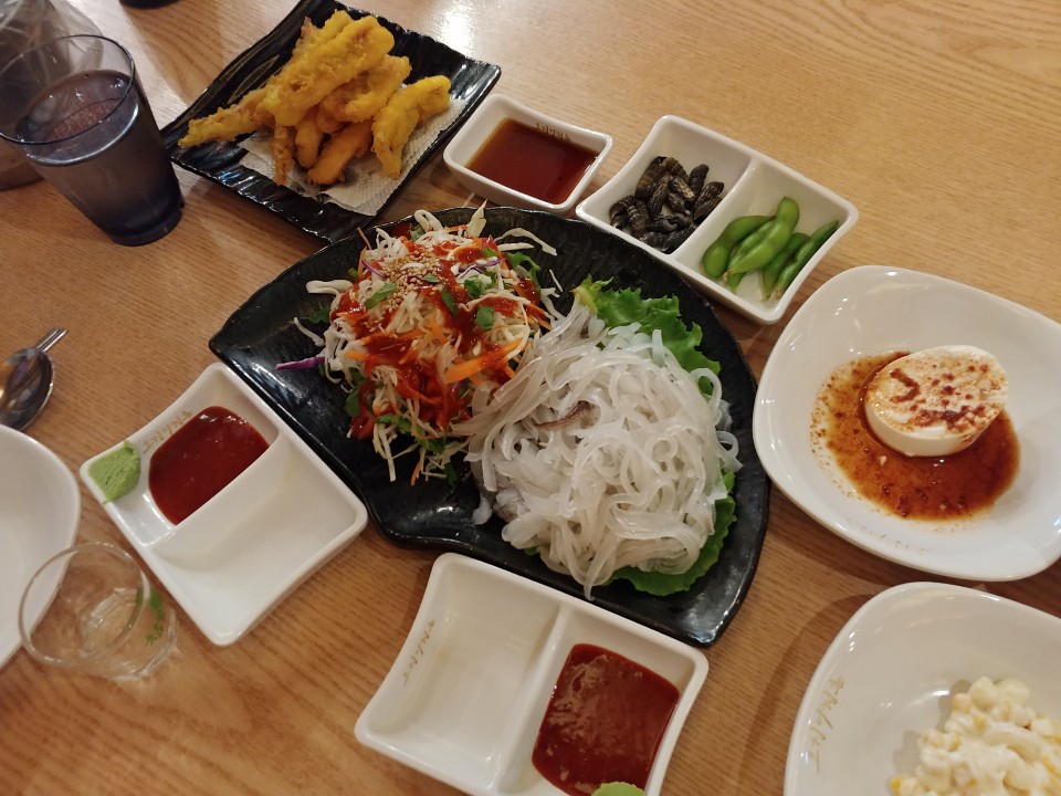 청주 강서동 오징어청춘. 오징어회를 주문하니 나온 밑반찬들이에요. 간장소스가 뿌려진 순두부, 샐러드 그리고 오징어튀김까지. 오징어회 하나만 주문했는데 이정도면 알찬 구성이라는 생각이 들었답니다.