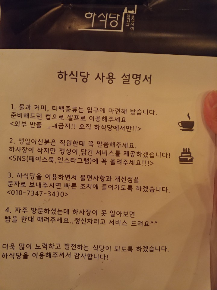 안양일번가 하식당의 메뉴판을 보면 하식당 사용설명서가 준비되어 있답니다. 직원분이 가져다 주는 컵을 이용하여 물을 셀프로 이용하시면 된니다. 준비된 음료는 티백류와 커피가 있답니다.