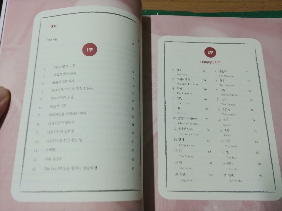 책에 목차를 한번 봐볼게요. 타로카드 한 권으로 끝내기 1부를 보면 타로의 역사부터 배움에 있어서의 마음가짐 그리고 타로와 같이 사용하면 좋을 소도구 등등 간략하게 설명이 되어있어요.