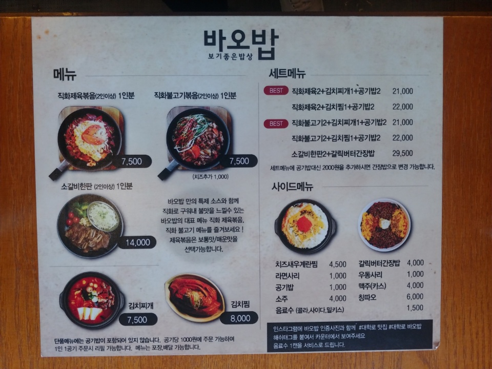 대학로 밥집 바오밥의 메뉴판인데 한번 보셔요. 가격자체는 부담스럽지 않으며 메뉴자체는 많이 적지만 이 이유는 나중에 알 수 있었어요. 이 날 갔을 때에는 직화불고기볶음과 김치찌개를 시켰답니다. 김치찌개를 시킨다고 해서 공기밥이 따로 나오지는 않아요. 저희는 처음부터 갔을 때 갈릭버터간장밥을 같이 주문했어서 음식이 나온 후에 공기밥이 같이 안나온다는 걸 알 수 있었어요.