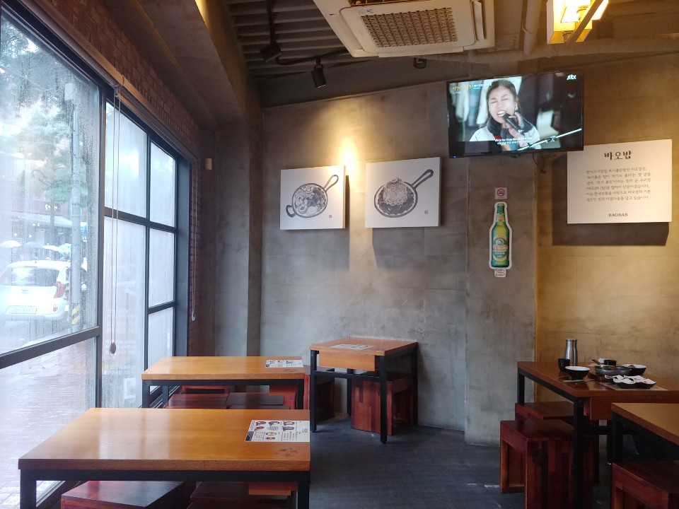 저희가 막 들어왔을때엔 오른쪽 끝 테이블에 손님이 있었어서 매장을 찍을 수 없었는데, 음식을 기다리는 중에 손님이 계산을 하고 가시더라구요. 그래서 대학로 혜화역 바오밥의 실내를 찍을 수 있었어요. 실내는 비가 왔어서 그런지 약간 차가운 느낌이 좀 있었어요. 벽 때문인 것 같은데 시멘트로 되어 있어서 더 더욱 그런 느낌을 받았던 것 같아요