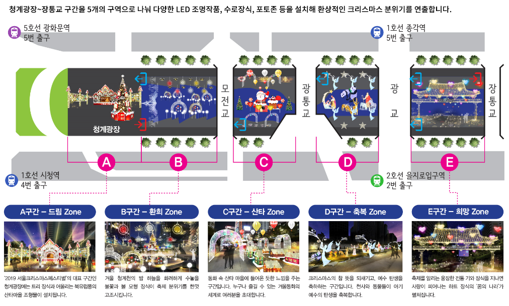 위에서 언급했 듯 2019 서울 크리스마스 페스티벌의 장소는 청계광장에서 장통교까지로 총 5개의 구역으로 나누었다고 하는데요. 각 테마마다 다양한 LED 조명작품 그리고 수로장식 포토존등을 설치함으로써 크리스마스 분위기속에서 이쁜 사진을 남길 수 있고 시각적으로도 인상깊은 축제를 위해 많은 준비를 했다고 합니다.