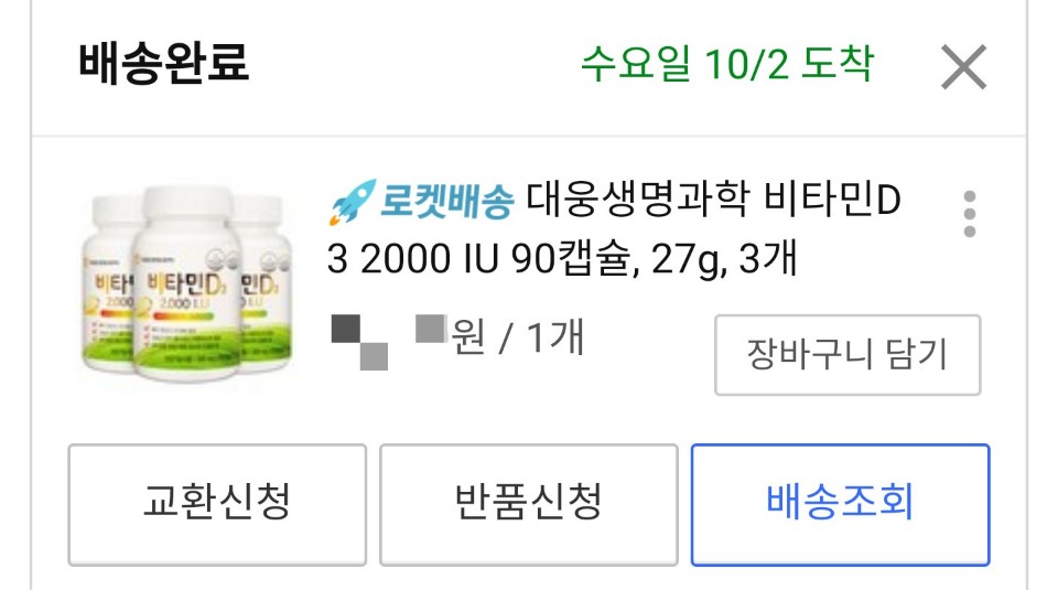 지난 9월 말에 주문하여 10월 2일에 받을 수 있었던 대웅 생명과학 비타민 D3 2000IU.