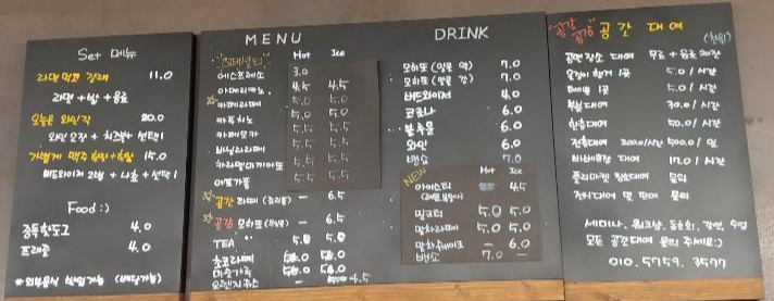 처음에 메뉴판에 주문할 음료만 보다가 주문을 다 마치고 난 후 보니 공간 대여가 따로 쓰여져 있어서 신기했어요.