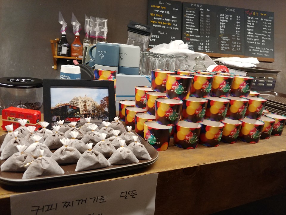 자칫 심심할 수 있는 홀더나 커피찌꺼기도 이쁘게 진열해 놓음으로써 인테리어로 활용하고 있는 공간 공감 카페