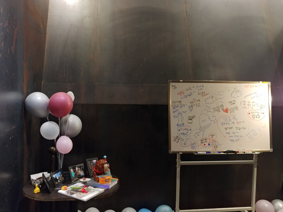 칠판에 이것저것 쓰여져 있는 것을 볼 수 있는데 나중엔 칠판을 싹 다 저희들만의 글로 가득 채웠어요.