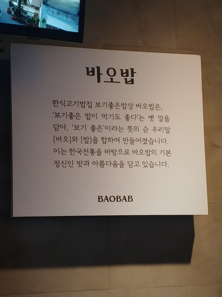 바오밥의 뜻이 나와있는 판이 벽에걸려 있어서 한번 찍어봤어요. 바오밥의 뜻은 보기좋은 밥이 먹기도 좋다는 옛말을 담고 있다고 하더라구요. 바오는 보기 좋은 이라는 뜻의 순 우리말과 밥을 합쳤다고 합니다. 바오밥이라는 이름이 이런 뜻을 담고 있는지 몰랐는데 이쁘다는 느낌을 받았어요.