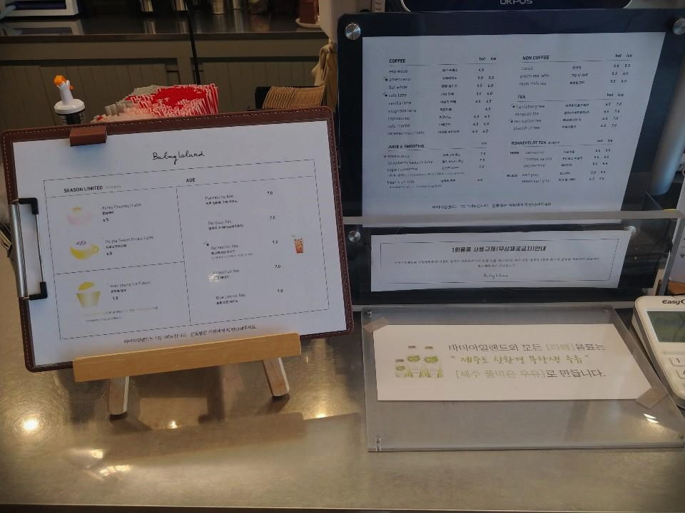 제주도의 모든 카페가 똑같진 않겠지만, 바미아일랜등드의 우유가 들어가는 음료는 제주 풀먹은 우유로 만든다고 적혀있더라구요. 아마 제주도의 고기는 다 제주산던데, 우유 또한 제주산으로 사용을 하는 것 같았어요.